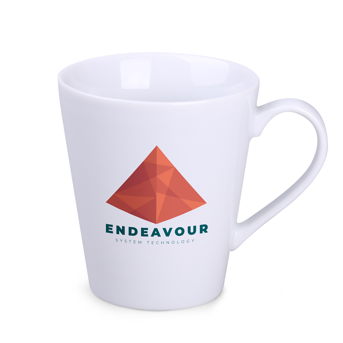 A capacious advertising mug with conoid sides, widening towards the top and wit a classic handle.