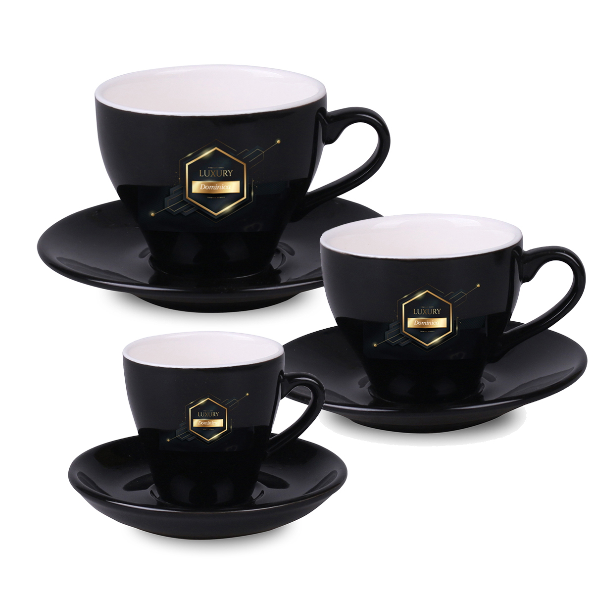 A coffee set consisting of three Venezia Coffee Set porcelain cups of different sizes. Classic design and timeless elegance.